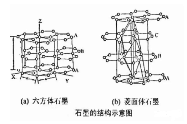 理想的石墨具有層狀結構,層面由SP2的碳原子形成類似苯環(huán)的巨大平面,層平面間的碳原子以δ鍵相互連接,鍵長0.142nm,鍵角120°。層面之間還有個連接所有碳原子的大π鍵。層間為0.3354nm。兩種晶型:六方晶系-2H型(a)和菱角體晶系-3R(b)Ø兩種晶型可以相互轉換:研磨和加熱。