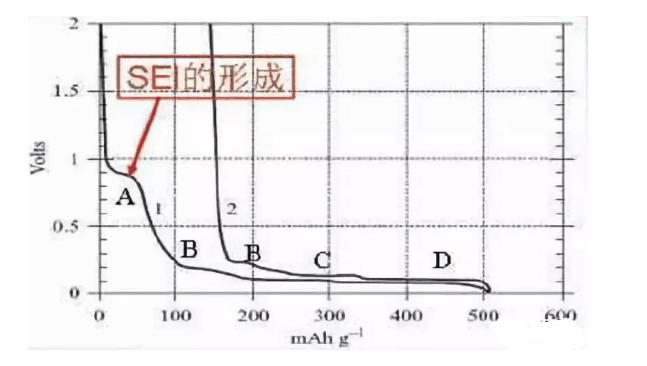 石墨理論容量372mAh/g,當然只有石墨化度非常高的材料才可以達到這個值。但是所有碳素材料在經(jīng)過首次充放電時都會存在由于副反應帶來的不可逆容量損失。隨著負極電位的降低,直到電解液中成分在負極表面形成一種穩(wěn)定的鈍化膜(SEI)而停止。首次放電出現(xiàn)四個電壓平臺(如下圖),其中A為SEI的形成,石墨大部分容量在0.3~0.005V范圍內(nèi)。除A之外,不同的電壓平臺對應著不同的嵌鋰狀態(tài),分別稱之為四階、三階化合物…最后形成LiC6,達到理論容量372mAh/g,晶面間距變?yōu)?.37。(來源于書本期刊,不懂勿噴!)