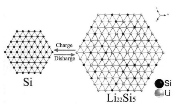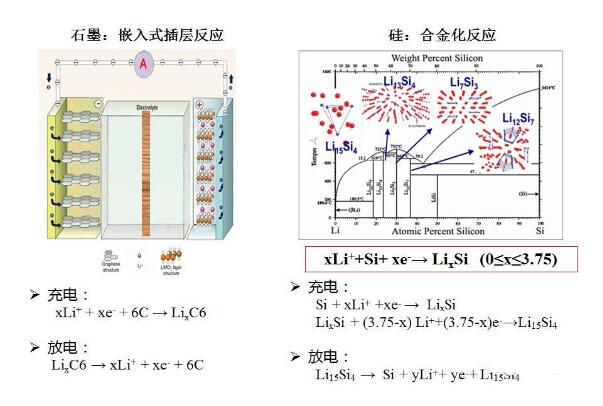 硅的充放電機理和石墨的充放電機理有所不同,石墨是鋰的嵌入和脫嵌,硅則是合金化反應。