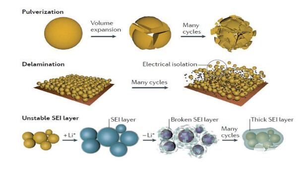 在充放電過程中,硅的脫嵌鋰反應將伴隨大的體積變化(>300%),造成材料結構的破壞和機械粉化,導致電極材料間及電極材料與集流體的分離,進而失去電接觸,致使容量迅速衰減,循環(huán)性能惡化。由于劇烈的體積效應,硅表面的SEI膜處于破壞-重構的動態(tài)過程中,會造成持續(xù)的鋰離子消耗,進一步影響循環(huán)性能。