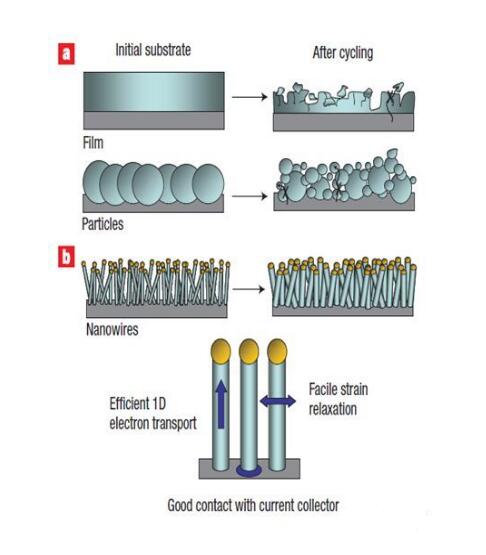 納米硅,通過制備成納米線,使得所有的硅得到利用,并預留膨脹空間,可有效改善循環(huán)性能。但是該方法成本較高,工藝制程復雜,制備難度較大。