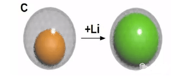 硅/碳復合材料,主要是碳包覆,如下圖,雖然預留了膨脹空間,改善了循環(huán)性能,但是壓實密度小,且工業(yè)化難度大。